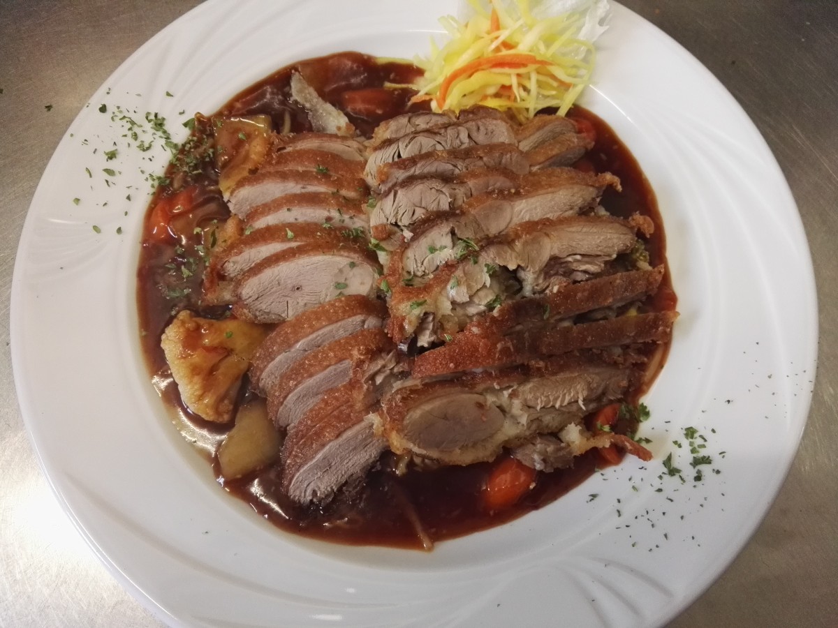 Knusprige Ente mit Gemüse und Pfeffersoße.